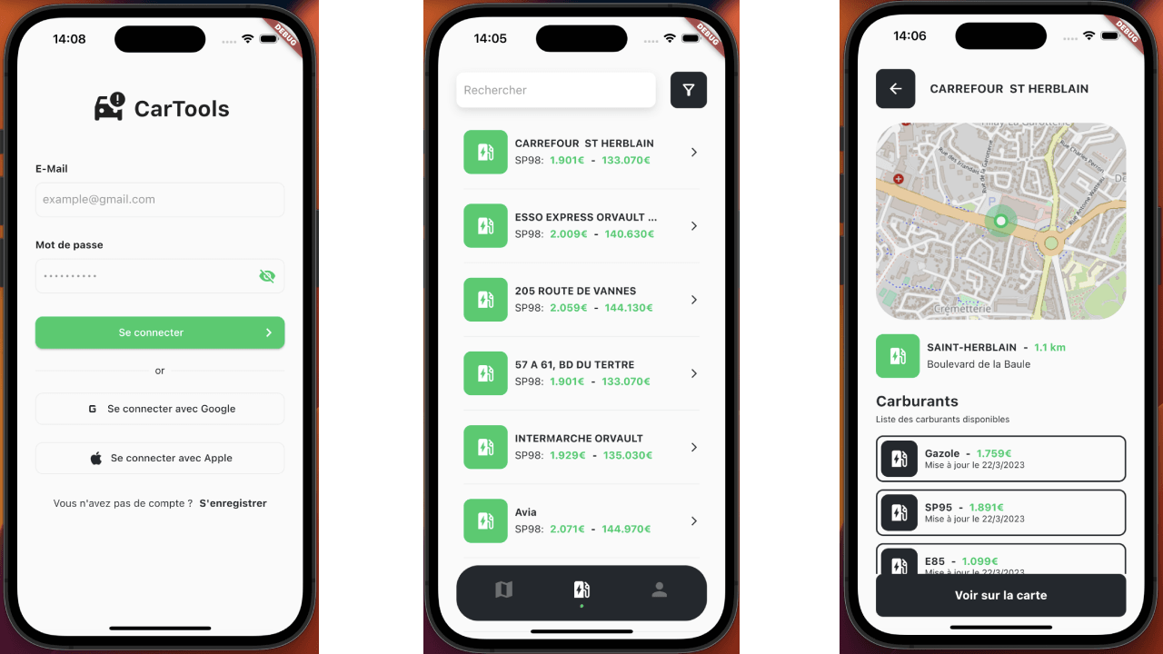 Application mobile multiplateforme fonctionnant sur Android et iOS pour la recherche de stations essence dans les alentours avec un système de filtres et de cartographie. Pour ce projet, nous étions deux, Clément et moi, et nous avons décidé de réaliser un hackathon avec pour objectif de développer une application mobile fonctionnelle en quelques jours.